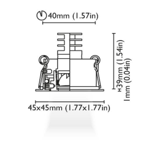 Faretto orientabile da incasso con riflettore snoot e cornice quadrata 45x45mm.